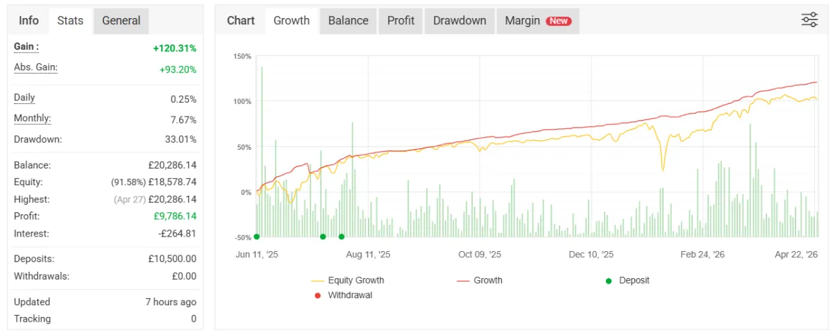 Live-tracked performance with verifiable audit trails (Myfxbook or independent providers).